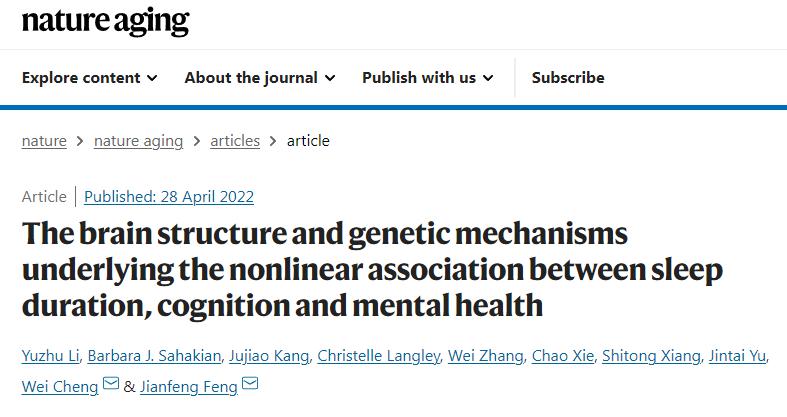 涓婃捣澶嶆棪澶у鍐缓宄版暀鎺堝拰鑻卞浗鍓戞ˉ澶у鐨勭爺绌朵汉鍛樺湪" Nature Aging "鏈熷垔涓婂彂琛ㄤ簡涓绡囬涓" The brain structure and genetic mechanisms underlying the nonlinear association between sleep duration锛宑ognition and mental health "鐨勭爺绌惰鏂囥
