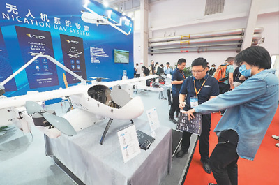 在北京亦创国际会展ä¸å¿ƒæ— 人机产业åšè§ˆä¼šä¸Šï¼Œè§‚众在å‚è§‚å«æ˜Ÿé€šä¿¡æ— 人机。