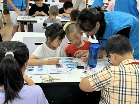 闅忓悗锛屽瀛愪滑杩庢潵浜嗘湡寰呭凡涔呯殑鎵嬪伐鍒朵綔鐜妭銆傚織鎰胯呬负瀛╁瓙浠噯澶囦簡绉戞櫘瀹為獙鏉愭枡鍖咃紝鎸囧浠栦滑鑷繁鍔ㄦ墜缁勮绠鏄撶數鎶ユ満妯″瀷銆傚瀛愪滑鎷胯捣鏉愭枡鍖咃紝鎸夌収鍒朵綔姝ラ锛屼粠鏈ㄦ澘鐨勫畨瑁呫佺數鏈虹殑鍥哄畾锛屽啀鍒扮數绾跨殑杩炴帴锛屾渶缁堝疄鐜版寜閿彂閫佺畝鍗曠殑鐢电爜淇″彿锛屼綋楠岀數鎶ラ氫俊鐨勪箰瓒g殑鍚屾椂鍏呭垎鎰熷彈浜嗙鎶榄呭姏銆