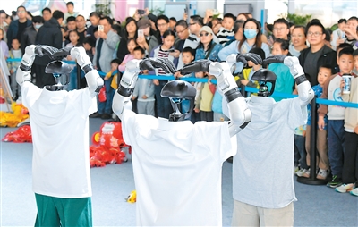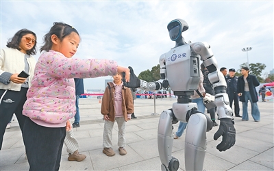 10月25日,江è‹çœæ‰¬å·žå¸‚公安局在扬州市明月湖广场举行è¦è¥å¼€æ”¾æ—¥æ´»åŠ¨ï¼ŒçŽ°åœºè®¾ç«‹å¤šä¸ªä¸»é¢˜äº’åŠ¨å±•åŒºï¼Œå¸‚æ°‘å¯ä»¥è¿‘è·ç¦»æŽ¥è§¦è¦åŠ¡è£…å¤‡ã€‚å›¾ä¸ºäººå½¢æœºå™¨äººä¸Žå°æœ‹å‹äº’动。
