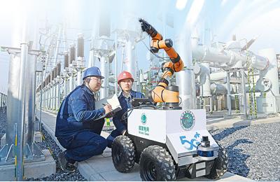 技术人员æ£åœ¨å¯¹ä¸€å°æè½½DeepSeekå¤§æ¨¡åž‹æŠ€æœ¯çš„æ™ºèƒ½å·¡æ£€æœºå™¨äººè¿›è¡Œå·¡æ£€æ•°æ®æ ¡æ ¸ã€‚